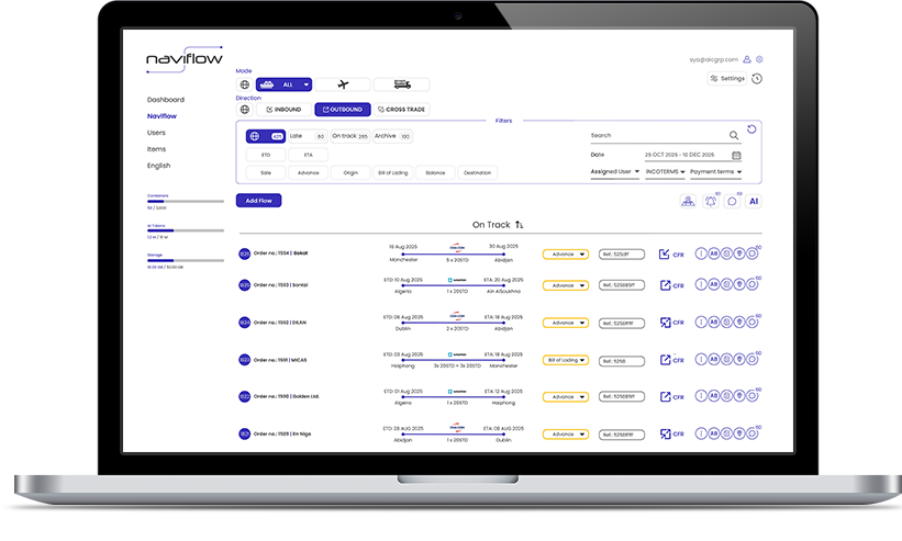 Naviflow is an AI-powered platform for shipment operations—orders, documents, and logistics—unifying work from PO/contract to Proof of Delivery.